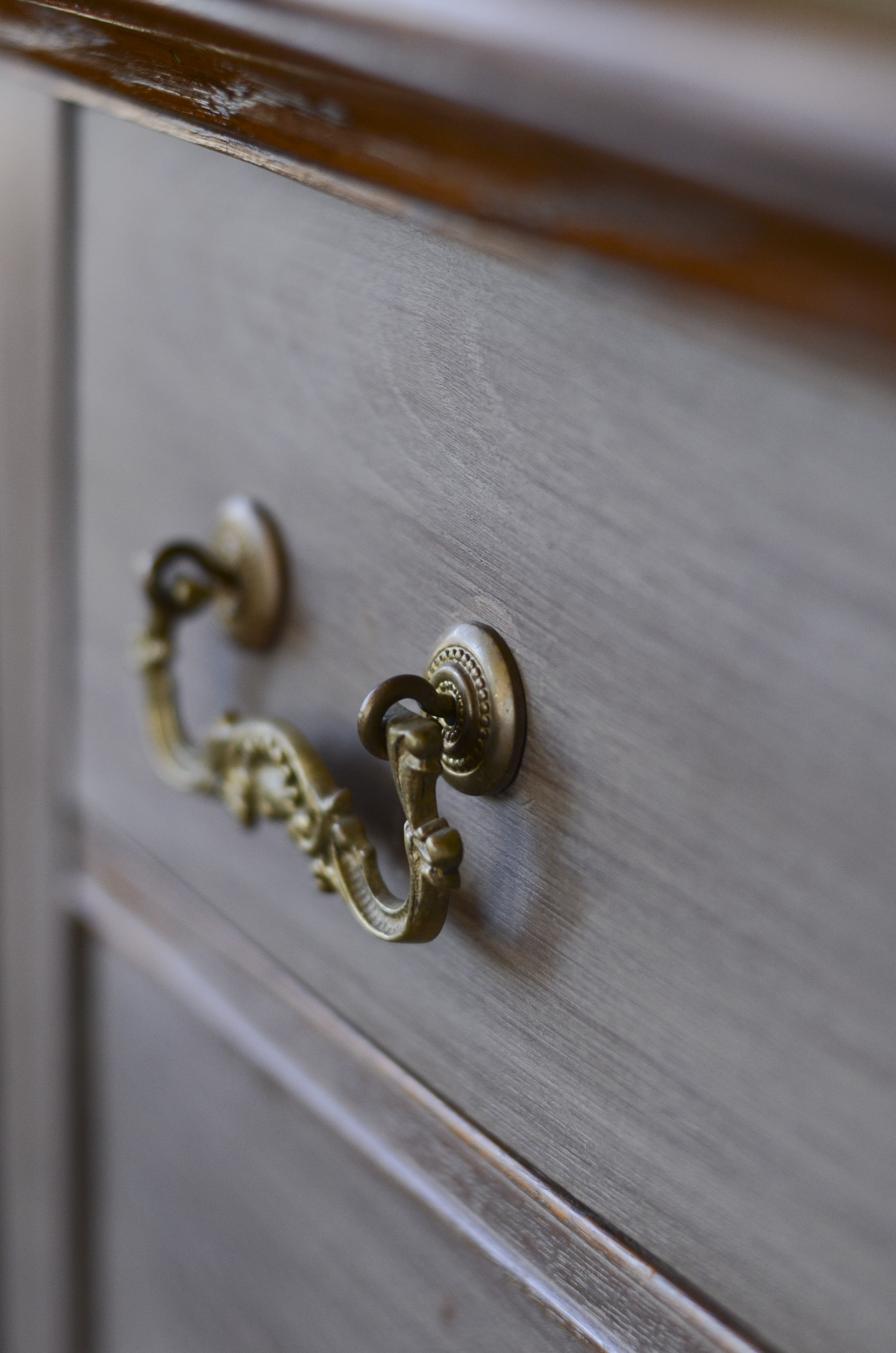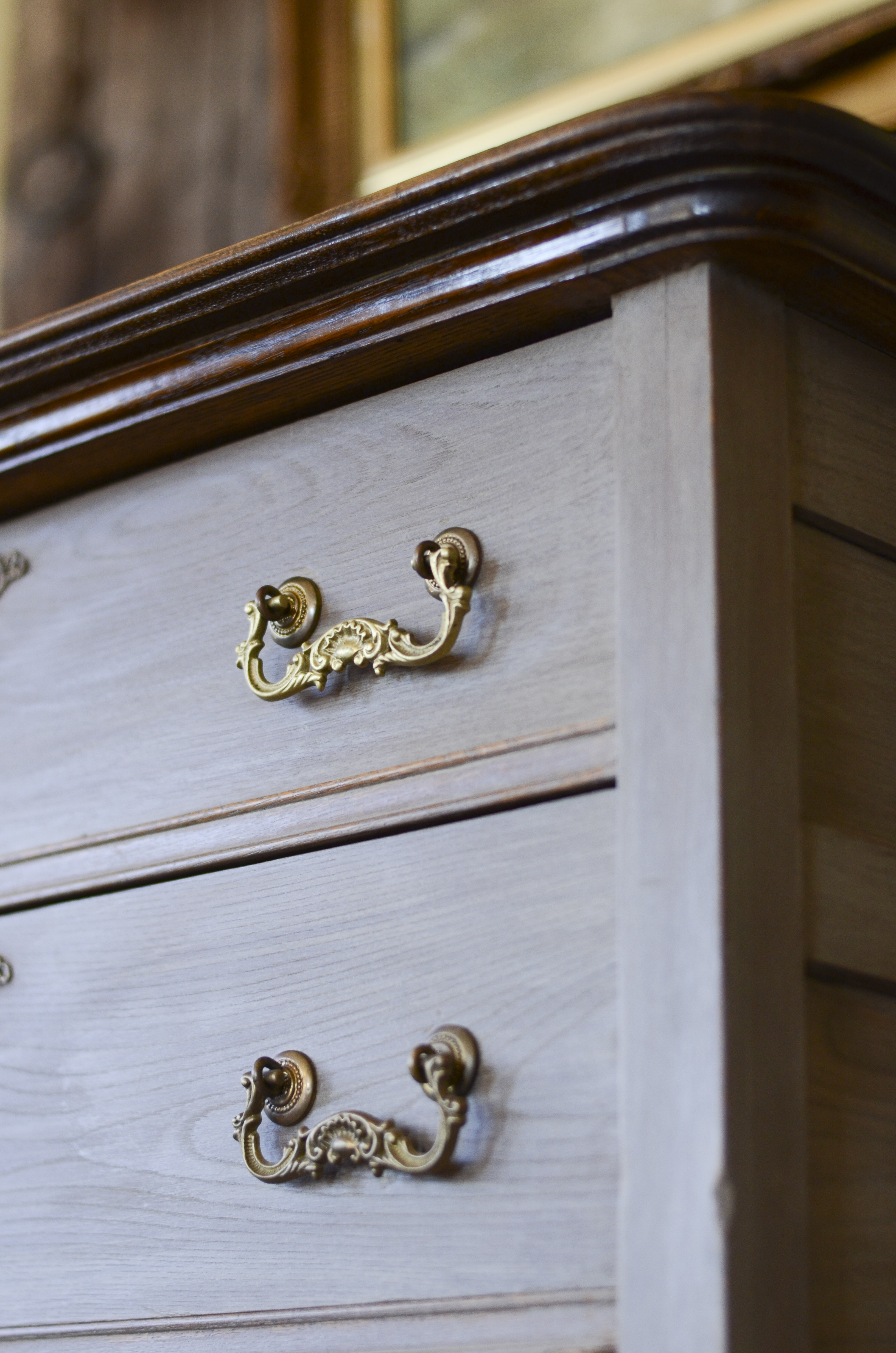 This dresser stumped me for the longest time. And it looked pretty good too, as is, though not particularly interesting. Originally, I tossed around a lovely coral color. But it didn’t feel right. I liked texture of the grain and the hardware and so wanted to somehow keep those elements in place as much as possible.