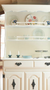 I was excited to use Velvet Finishes (VF) products—it’s a product line I hadn’t used prior to the contest. Kellie notes that the paint is not a chalk paint, not a milk paint, but rather a “specially formulated, low VOC and non-toxic, latex, water-based paint.” I choose Rococo–a lovely cream color that suited Olivia’s desired look; in fact, both the color and the hutch suit the “Color Your World” theme to a proverbial “T.”