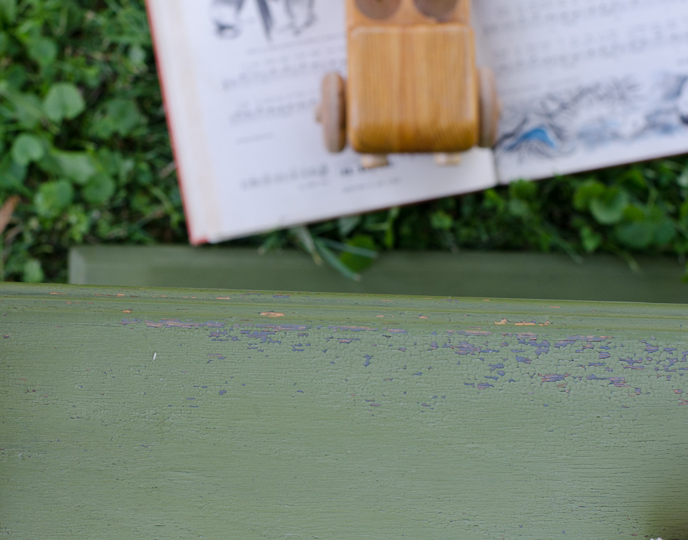 As you’ll see, I left some of the original OFMP intact and some blue peeks through the Bayberry green, which I really like. The paint crackled a bit, likely because I painted the piece in the hot sun (intentionally) for the crackling effect.