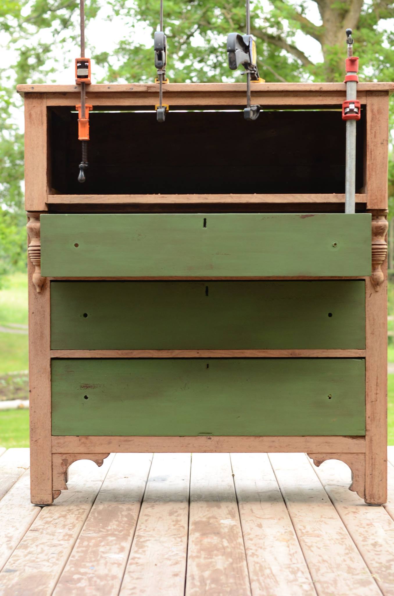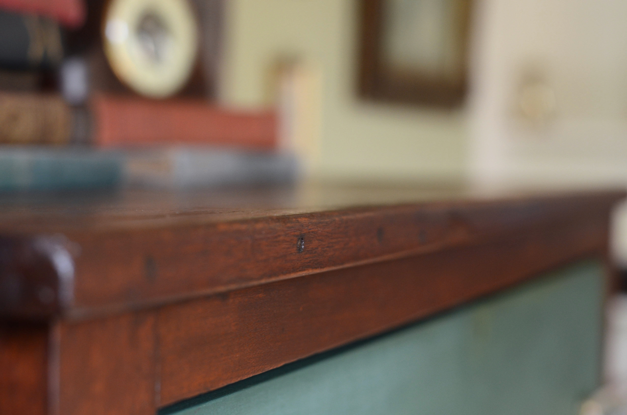 In terms of finish I layered milk paint–two different greens–on the drawers and allowed it chip as it would. If you’ve ever used the medium, you know that you have minimal control over how the paint finishes. I stained and varnished (yes, varnished) the body. I chose an oil-based product from Sherwin Williams, applied two coats with a quality brush, while sanding between coats. I wanted a durable topcoat–I haven’t found wax to be that durable–and one that was in keeping with dresser’s age. Poly was too new a finish for something this aged.