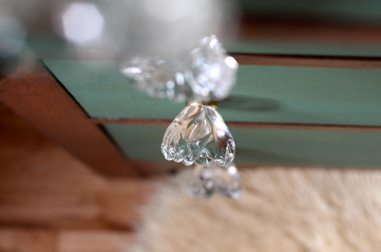 As far as knobs went, I initially had my heart set on some oversized bone ones, similar to those used by Ferpie and Fray, The Weathered Door, and Phoenix Restoration. Ultimately, it wasn’t in the budget and so I went back to the drawing board, did some online digging and decided on something similar to what the originals might have looked like, but with a slight edge. I settled on these knobs: natural variations in size and shape of the glass, brass backed, on clearance, and the clincher: there were eight. I maybe took the last knob, the sample knob, from my local HL. They. are. perfect.