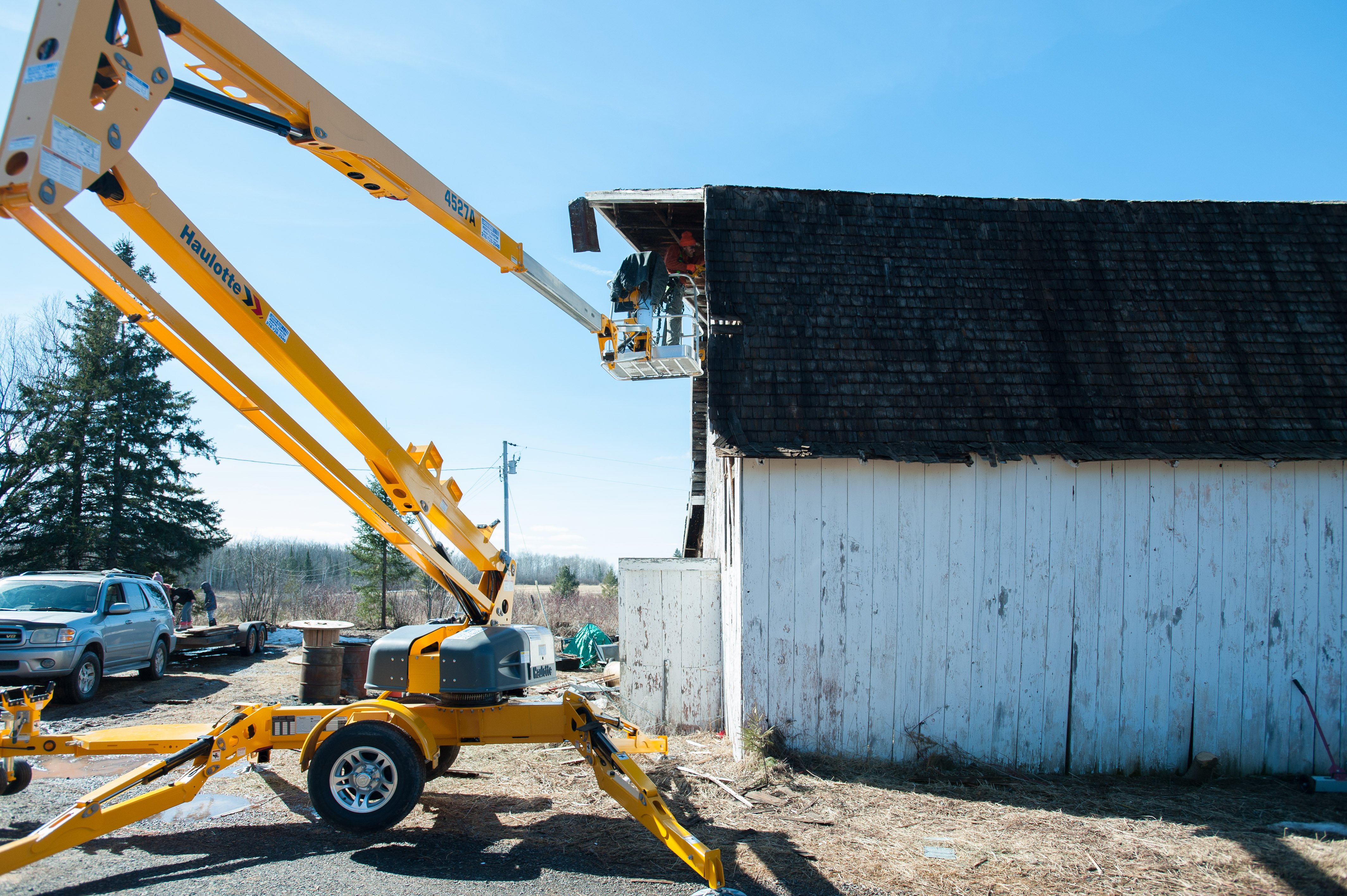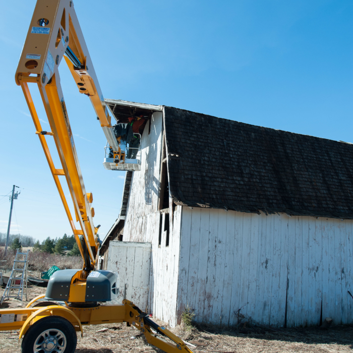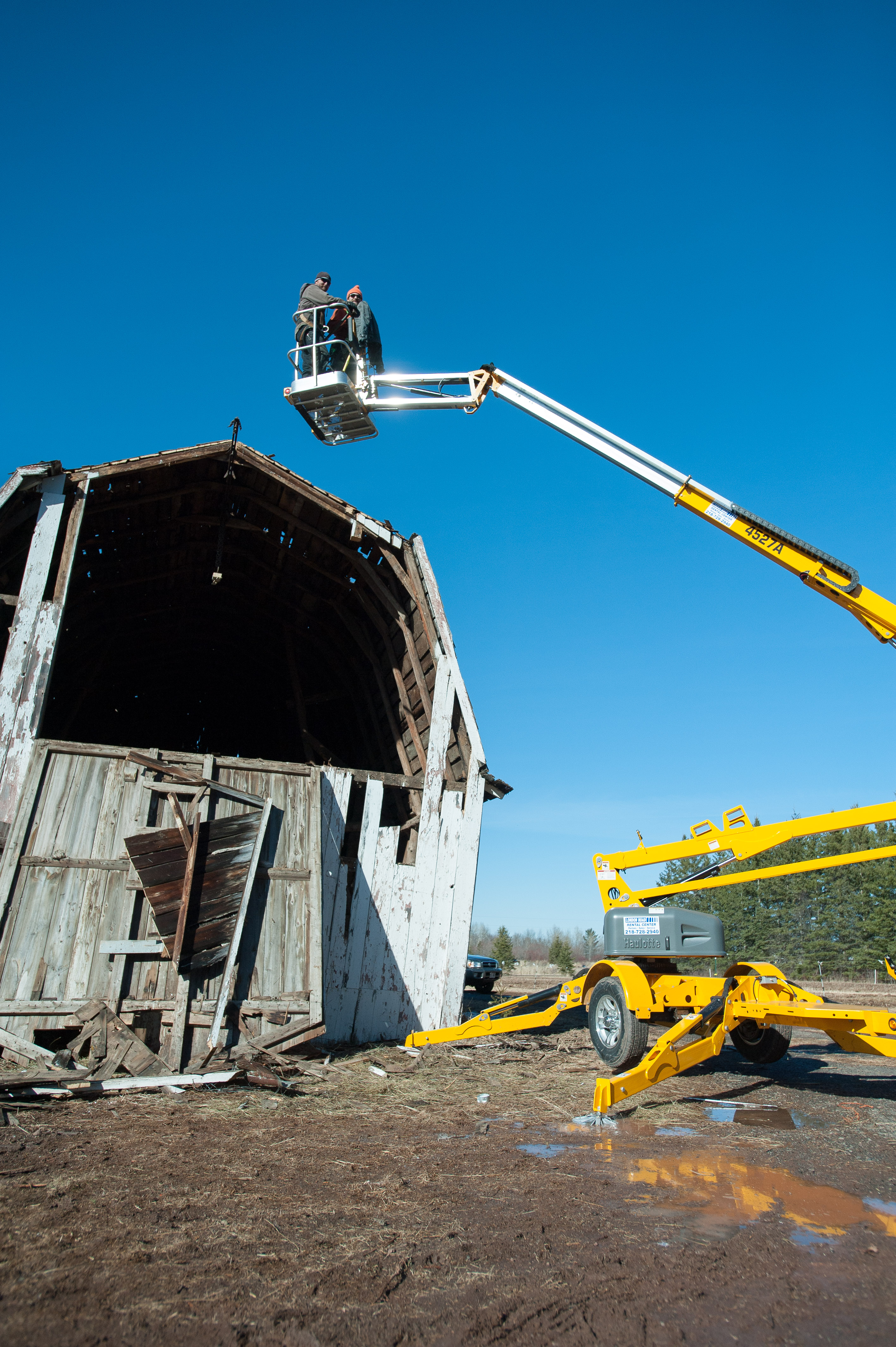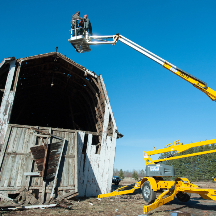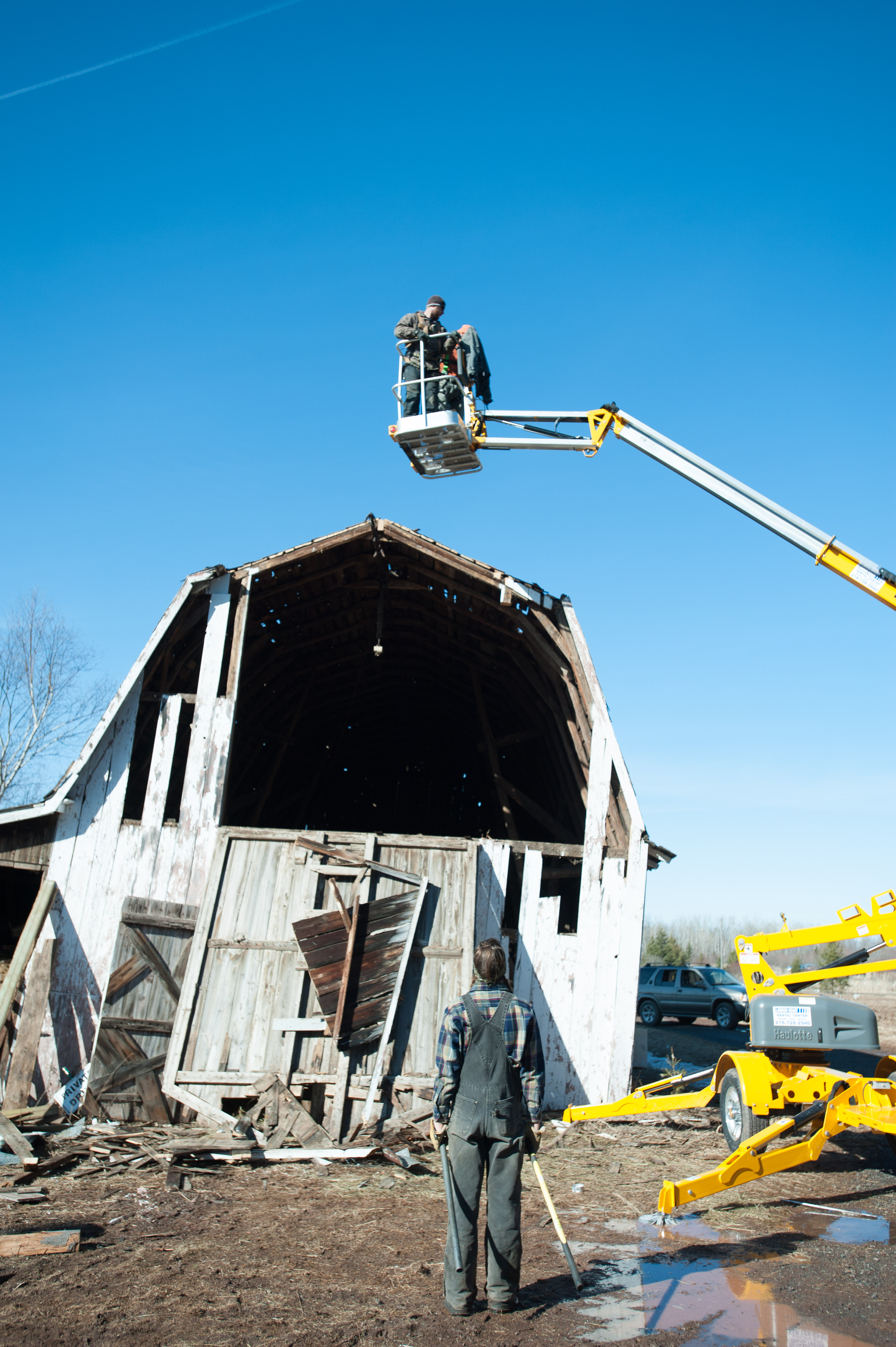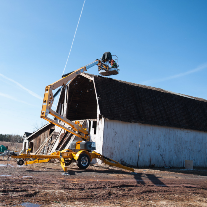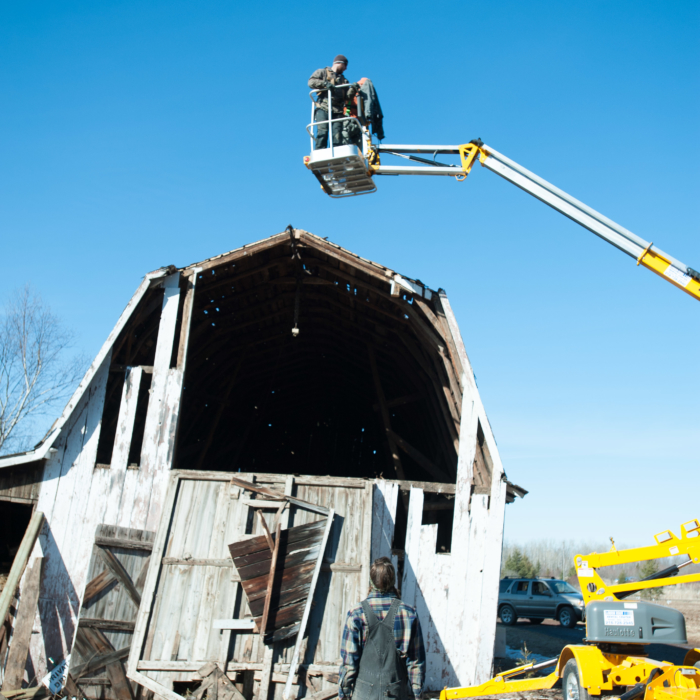 In the interest of safety, we rented a man lift to remove the last remaining tin high on the barn’s peak. The second part of the plan included included collapsing the barn’s roof, so we could safely remove the much-coveted #shiplap on the structure’s exterior, as we feared the barn, in its leaning, would collapse once we removed the shiplap. Nobody wanted that.