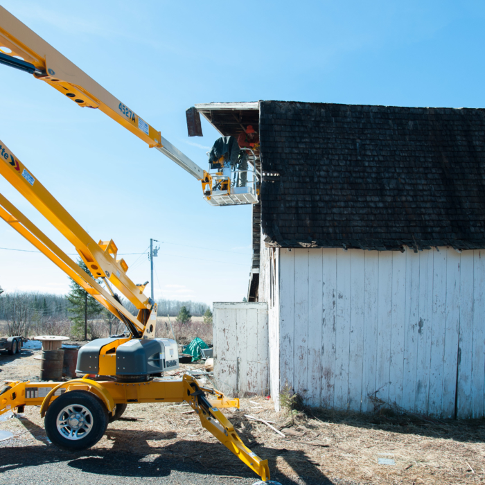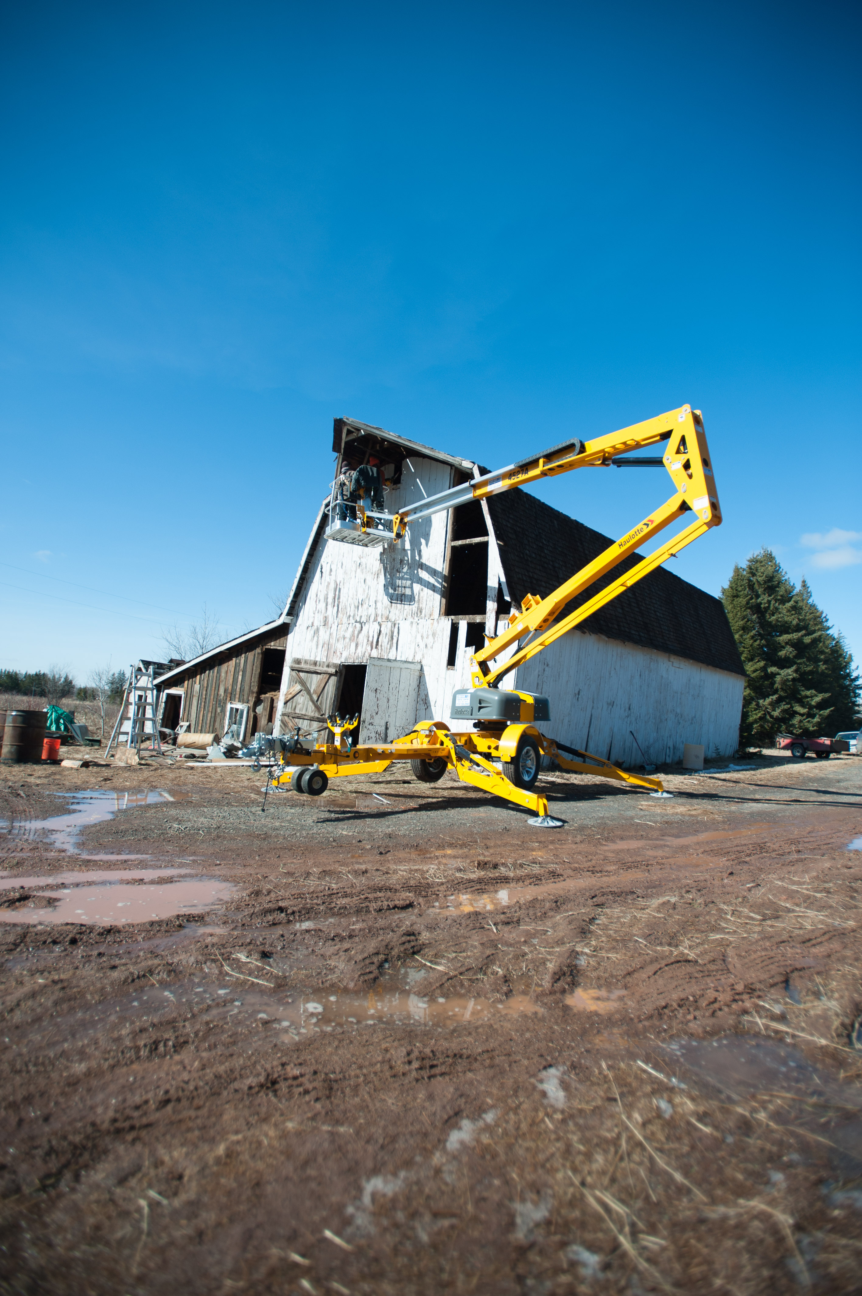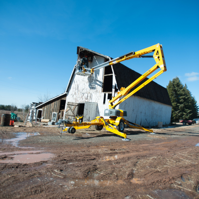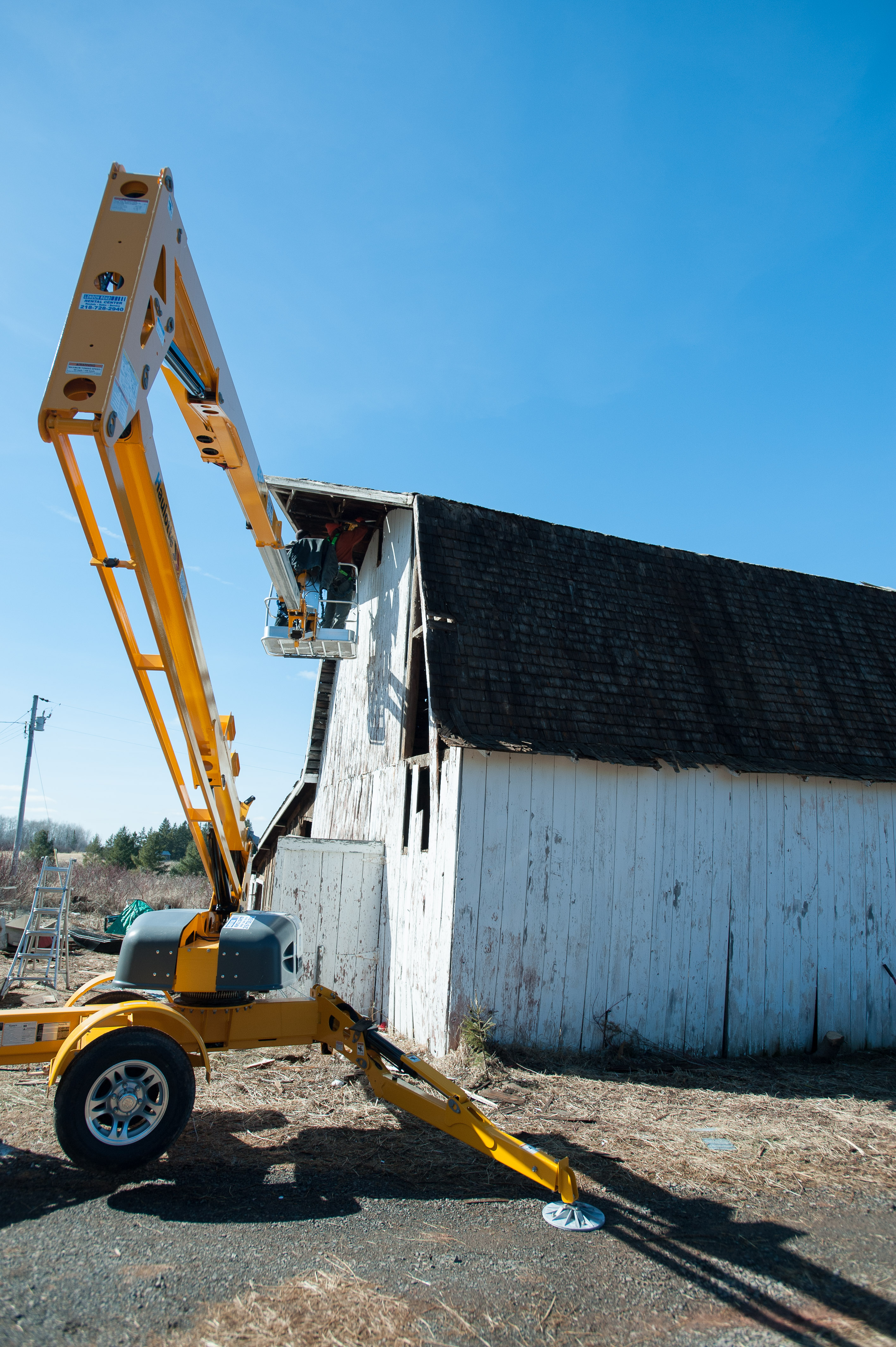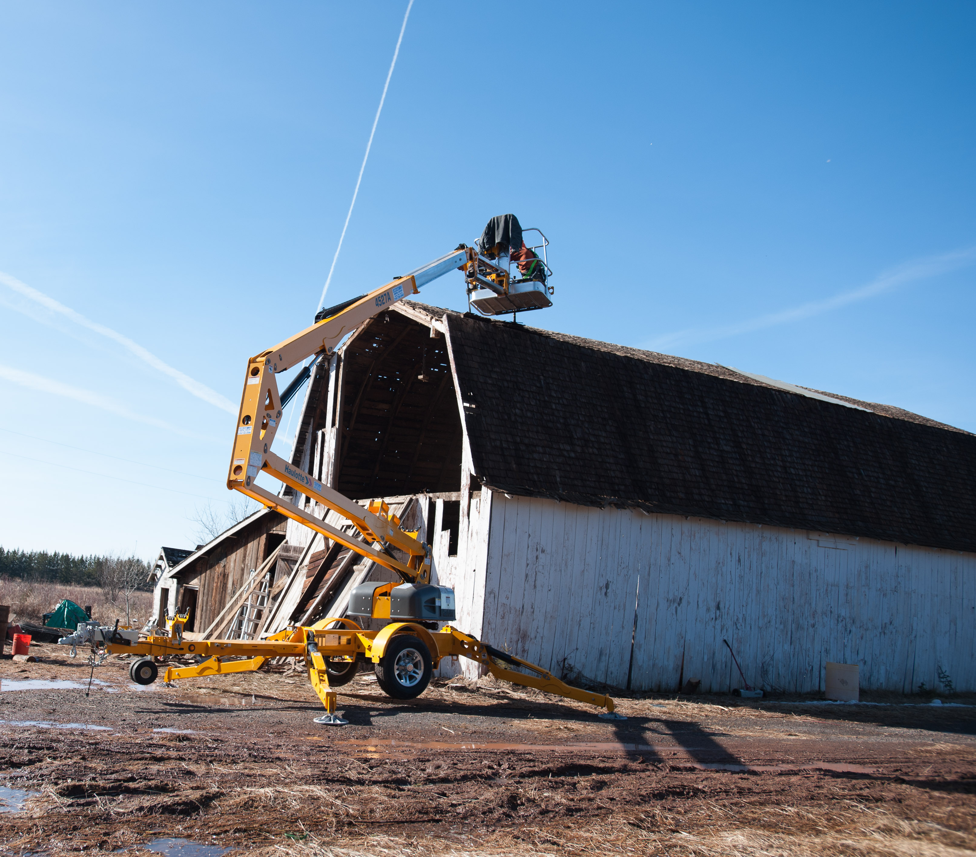 In the interest of safety, we rented a man lift to remove the last remaining tin high on the barn’s peak. The second part of the plan included included collapsing the barn’s roof, so we could safely remove the much-coveted #shiplap on the structure’s exterior, as we feared the barn, in its leaning, would collapse once we removed the shiplap. Nobody wanted that.