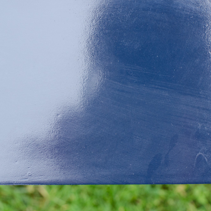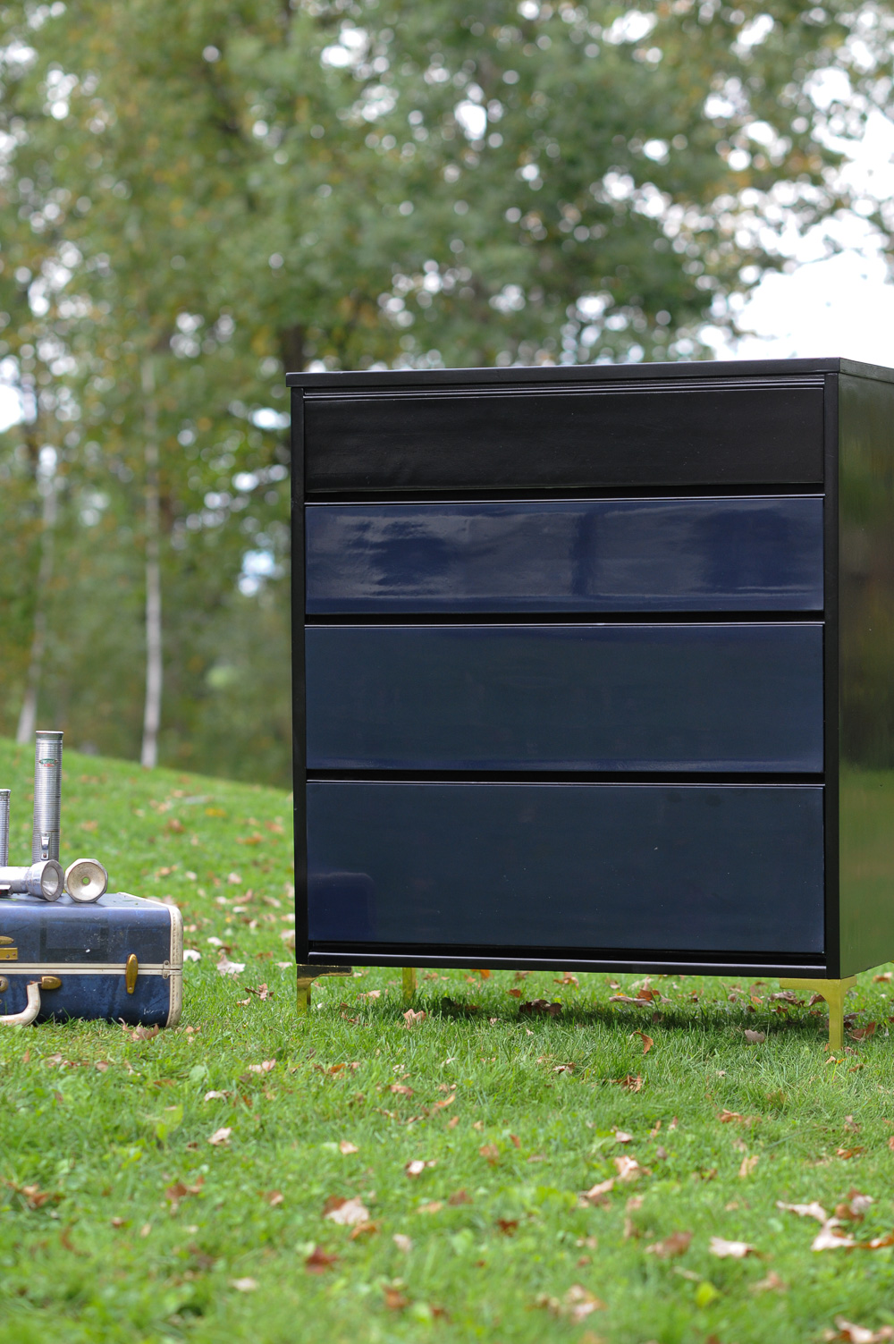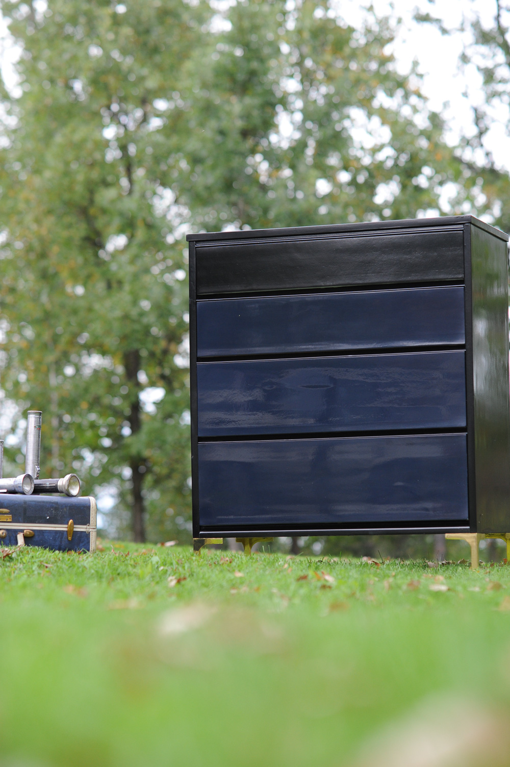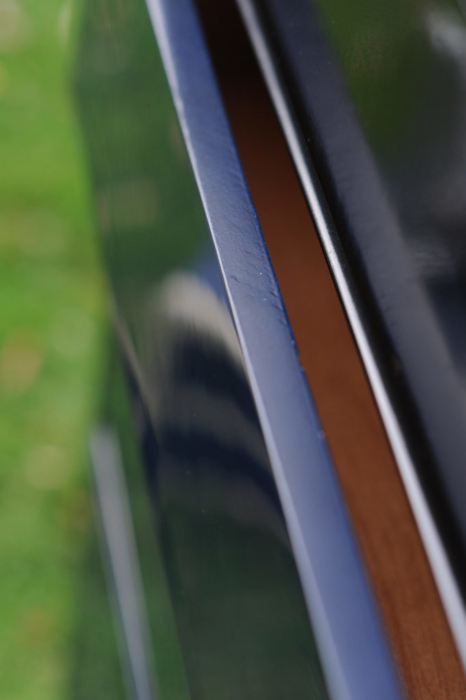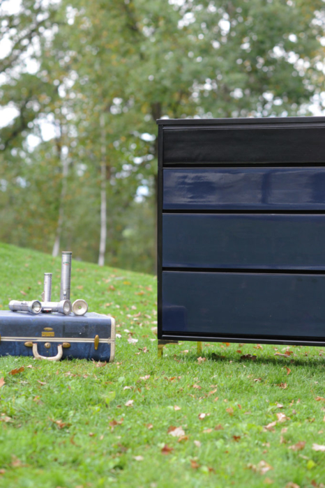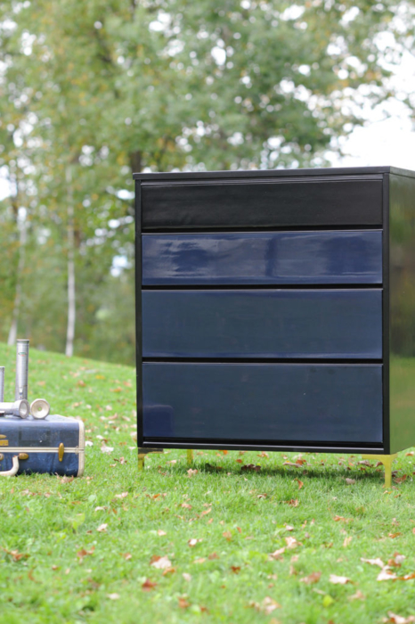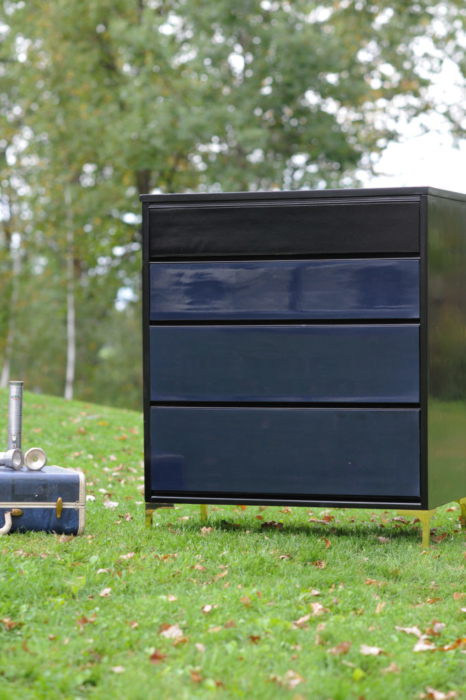 Enter a basic MCM piece. I custom-mixed GF Klein Blue and Lamp Black to create a midnight blue/black and sprayed 3 coats. After paint, I sprayed the carcass and drawers with 6 coats of GF water-based lacquer in gloss. I planned on rubbing out the finish so wasn’t overly concerned with a perfect, off-the-gun finish. A perfect off the gun finish is nice, of course, but not always doable, especially since I sprayed the clear lacquer under less than ideal conditions.