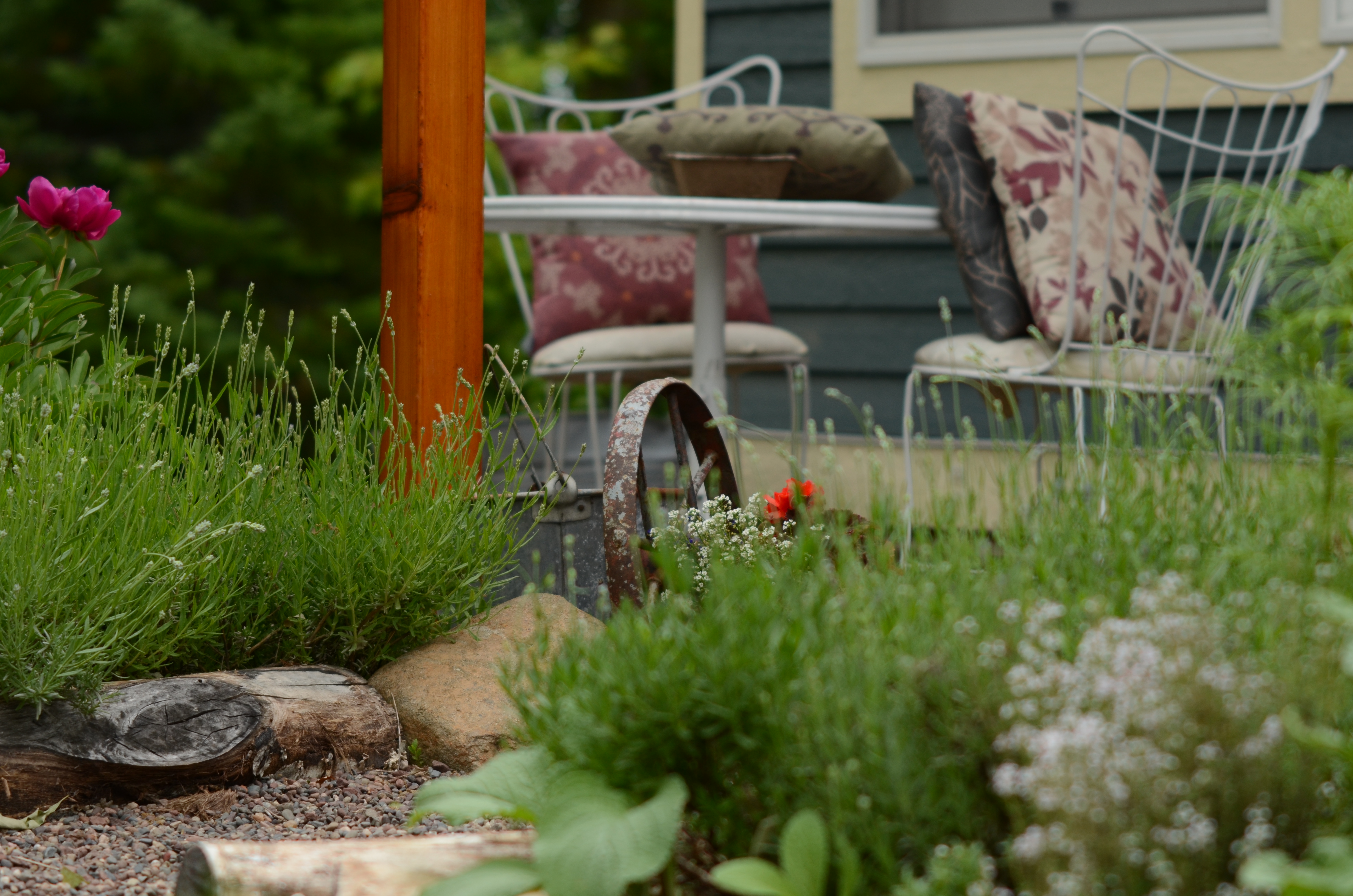 Figuring out what you really want–food, flowers, fragrance, privacy, or other things–defines how everything else looks and proceeds. For myself, I wanted a kitchen garden, which by definition is close to the house, full of herbs, vegetables, edible flowers, a combination of self-seeding annuals (easy and cheap!), and perennials.