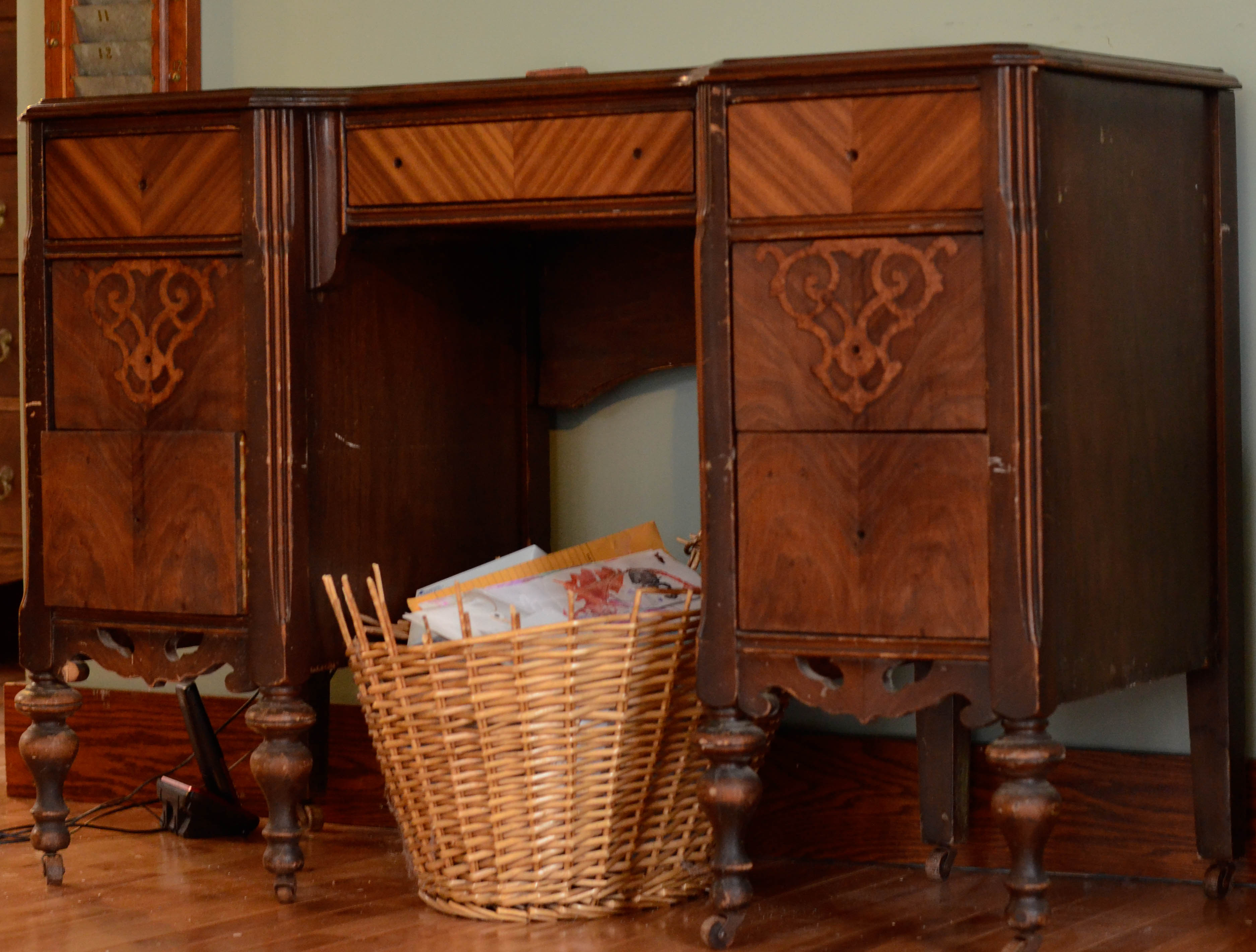 Ultimately, I decided to strip the top and drawer fronts; the veneer, as you’ll see, was too striking to cover with paint.