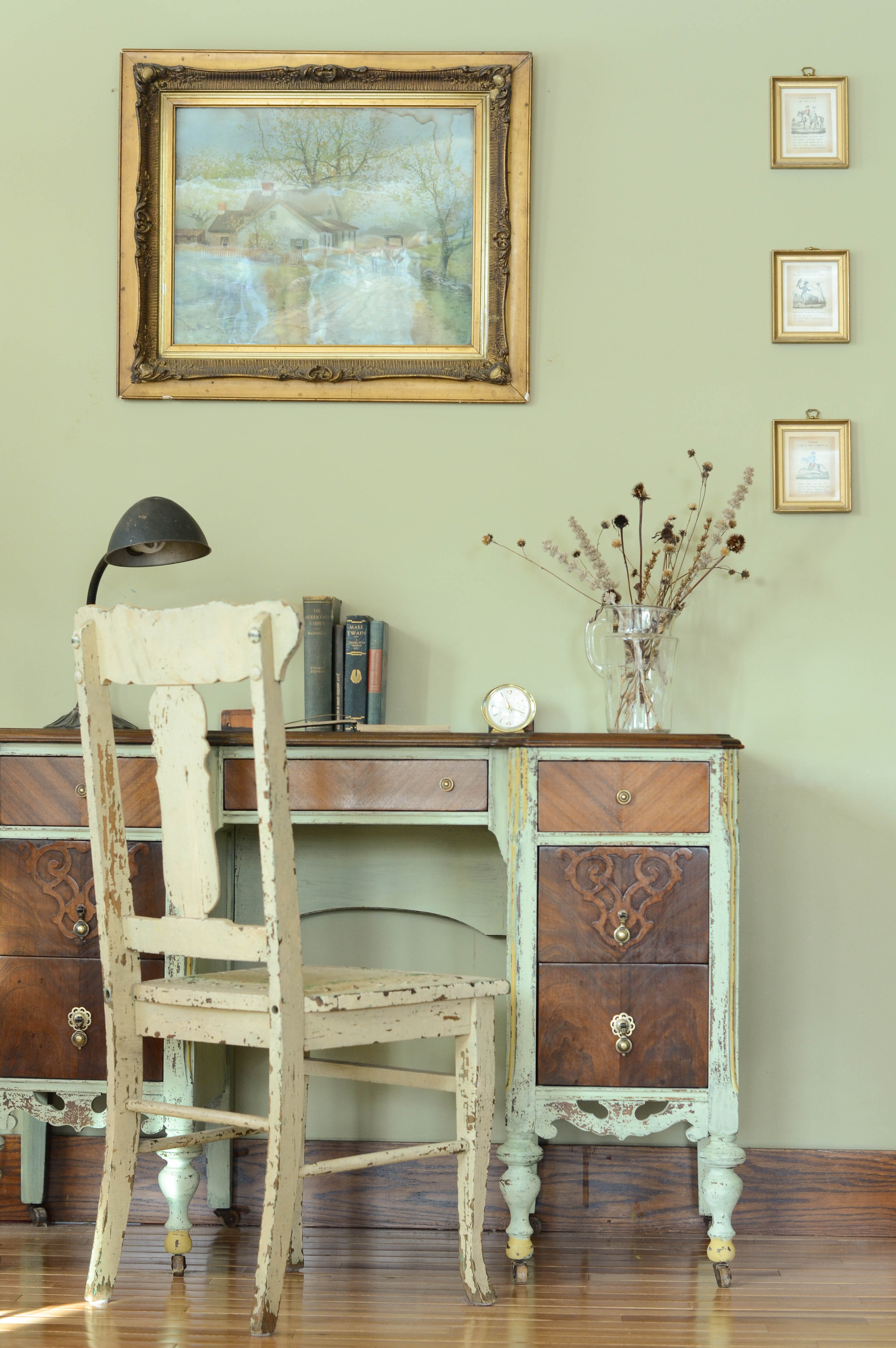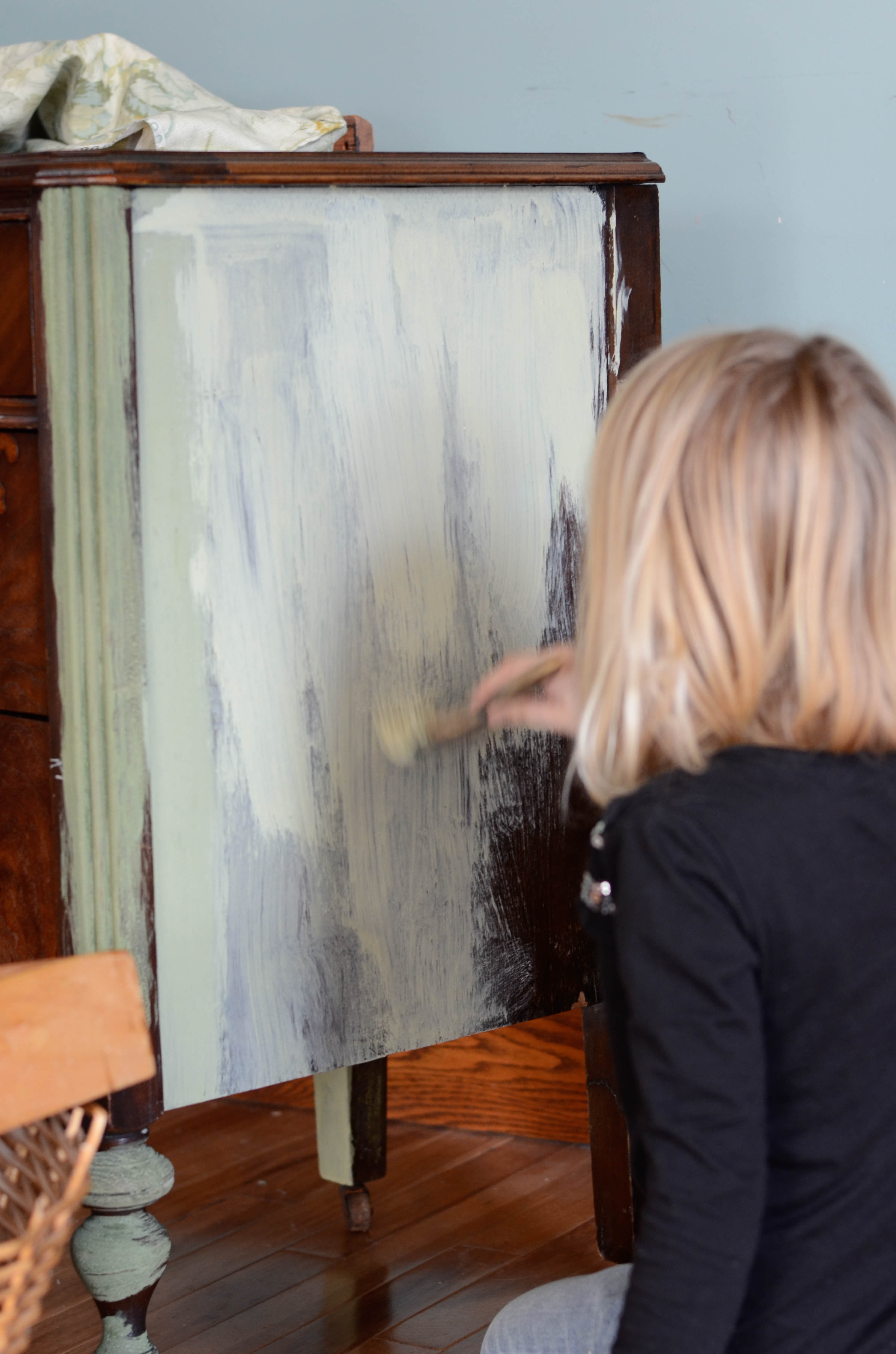 Slave labor aside, I ended up basing my overall color scheme on the fabric above and wanted to include some color variation in the final product that reproduced the lovely variation in the fabric. To create this effect, I used milk paint, my primary medium. Milk paint arrives at your doorstep in powdered form and then you mix it with water while controlling consistency, and color. See Techniques/Tutorials for general information on milk paint. Milk paint also lends itself well to layering colors, particularly if you use a wax resist or dry brushing technique. Here, I used a dry brush technique, brushing the light green over the darker green, while not covering it completely. An imperfect science to be sure, but fun! As you’ll see below, the darker green is just visible in some places, creating both depth and interest.